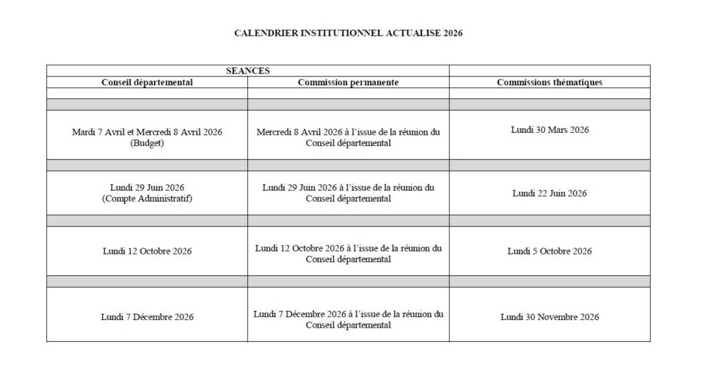 Retrouvez les prochaines dates des réunions du Conseil Départemental en 2026 :