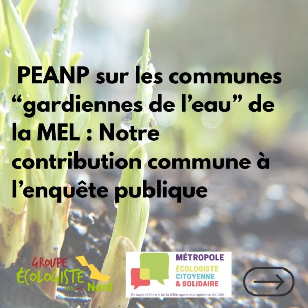 Enquête publique relative au projet de création d’un périmètre de protection des espaces agricoles et naturels péri-urbains (PEANP) sur le territoire des « gardiennes de l’eau » de la Métropole Européenne de Lille Contribution commune du groupe écologiste au Département du Nord et du groupe Métropole écologiste citoyenne et solidaire à la Métropole Européenne de Lille Lire la suite…